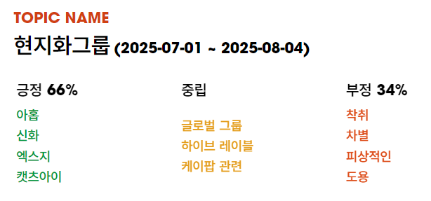동시에 팬들 사이에서는 그룹의 ‘케이팝’과 ‘글로벌’ 정체성을 두고 논쟁이 이어지고 있다. 대시보드의 ‘현지화 그룹’ 토픽 분석에서는 긍정 키워드로 ‘캣츠아이’, 중립 키워드로 ‘글로벌 그룹’, ‘하이브 레이블’, ‘케이팝 관련’이 언급되며, 다양한 시각과 논의가 활발하게 오가고 있음을 보여준다.
