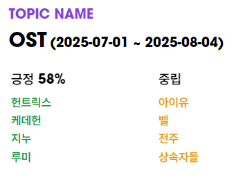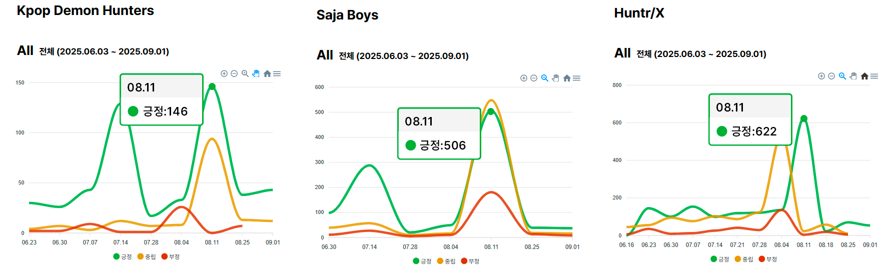 뛰어난 작품성과 케이팝적 완성도는 등장인물의 캐릭터 성격과 세계관을 정밀하게 구현해, 팬들의 통합적 몰입 경험을 끌어내고 있었다. 대시보드 분석에서도 이러한 현상은 뚜렷하게 드러난다. 예를 들어 OST 토픽의 긍정 키워드에는 영화 제목인 <케데헌>뿐만 아니라 주인공 그룹 ‘헌트릭스(Huntr/X)’, 캐릭터 ‘루미’와 ‘지누’가 함께 언급되며, 팬들이 음악과 캐릭터, 세계관을 하나의 패키지로 소비하고 있음을 보여준다.
