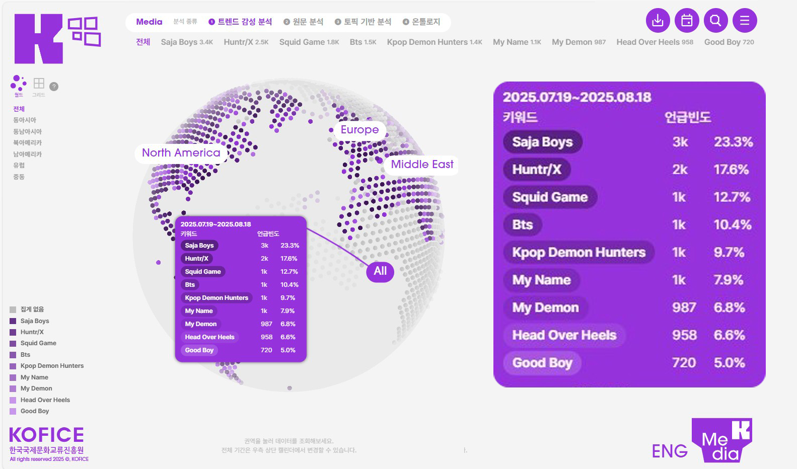 이처럼 <케데헌>의 폭발적인 글로벌 인기와 트렌드는 대시보드에서도 쉽게 확인할 수 있다. 최근 한 달(2025.7.19.~2025.8.18.) 동안 <케데헌> 관련 키워드는 케이팝 및 영화·드라마 모두에서 꾸준히 상위권에 자리 잡았다. 토픽 기반 분석(7월)에서도 ‘차트 진입 및 수상, 프로덕션(production) 퀄리티, 라이브 퍼포먼스, SF·미래주의적, 한국의 가족문화, 작품성, OTT, OST’ 등 8개 토픽에서 긍정적인 키워드로 동시에 언급됐다.