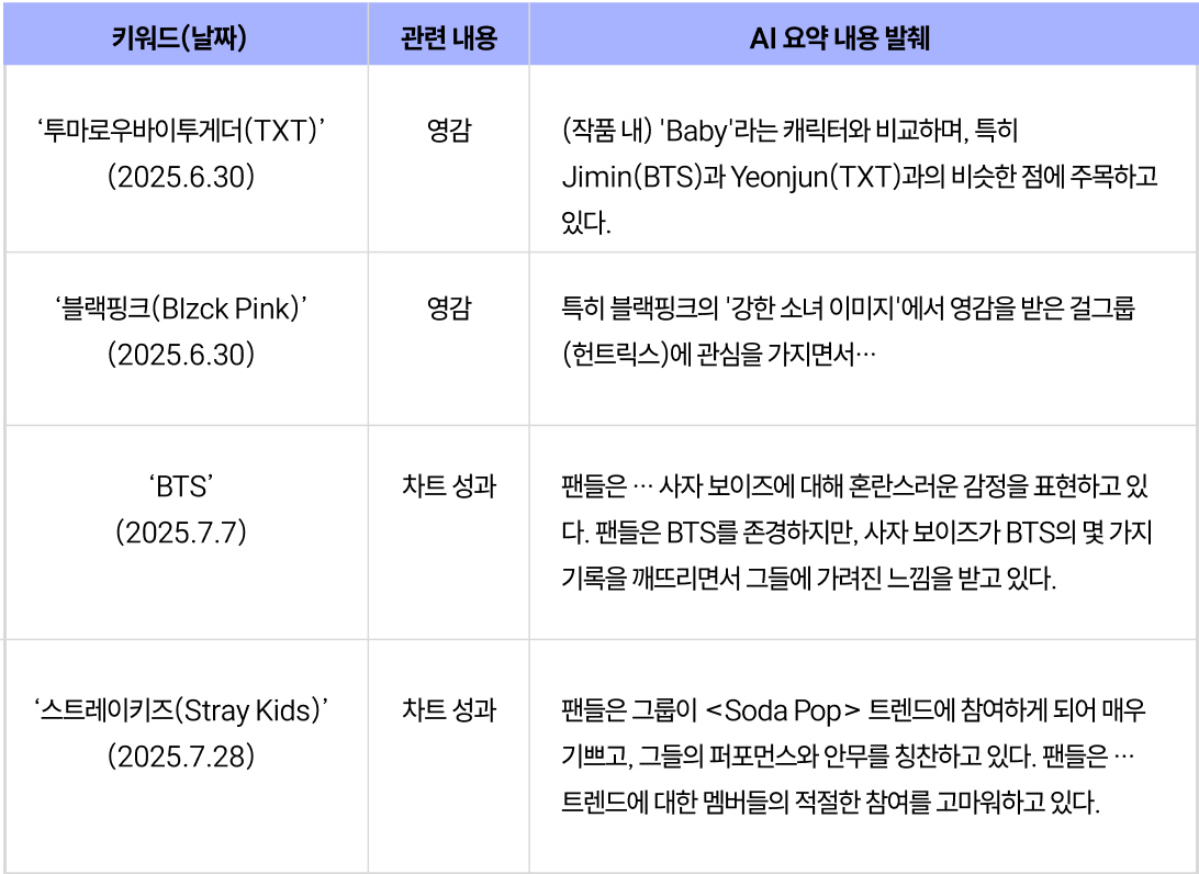 타 아이돌 키워드 AI요약 - <케데헌> 관련 내용 언급 |