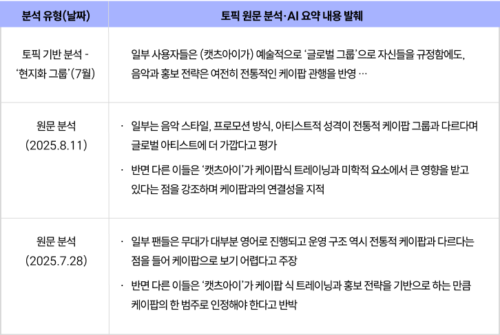 이 부분은 AI 한류 빅데이터 대시보드의 원문 분석 및 AI 요약을 통해 더 구체적으로 살펴볼 수 있다. 발췌된 요약문을 살펴보면, 팬들은 자신들이 상정하는 ‘전통적 케이팝 관행’과 ‘캣츠아이’의 행보를 비교하며 그룹의 케이팝 여부를 지속적으로 판별하려 하고 있음을 알 수 있다. |