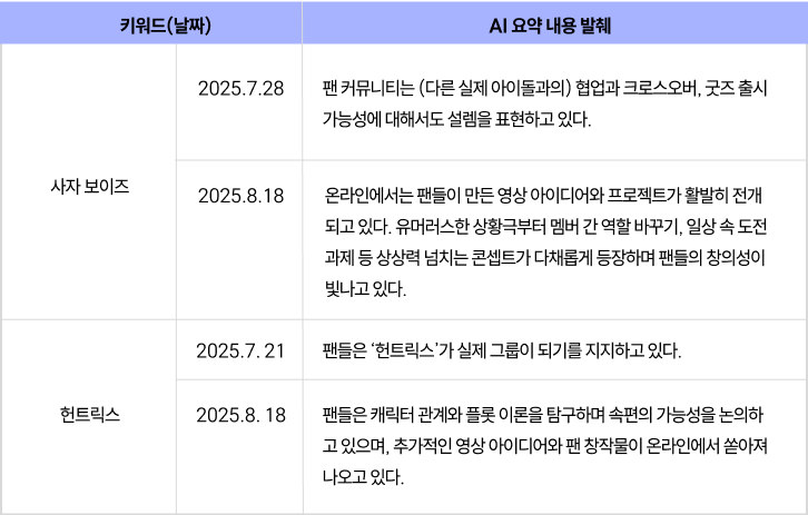 - AI 한류 빅데이터 대시보드 키워드‘헌트릭스’AI 요약(2025.8.11. 기준) 中