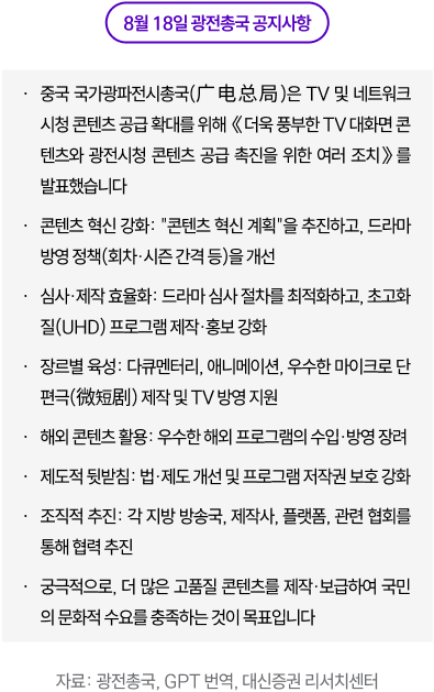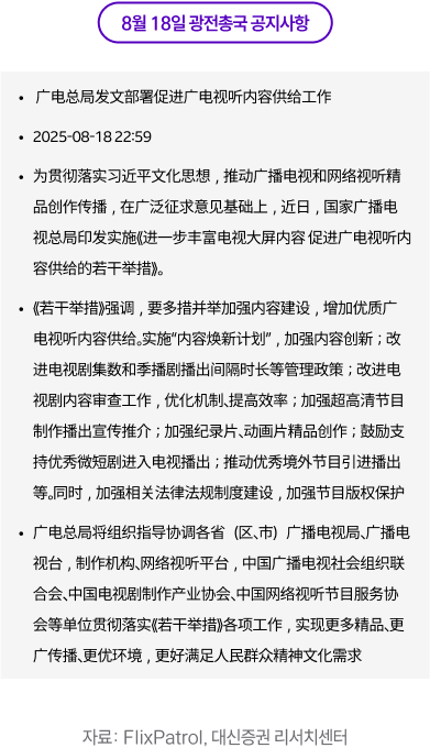 삼화네트웍스의 주가 상승 요인은 두 가지이다. 우선 신작 공급 일정이 확정된 점이다. 삼화네트웍스는 연간 평균 2편 정도의 작품을 제작하고 있으며, 올해 2025년 10월과 11월에는 《SBS》를 통해 <우주메리미>와 <키스는 괜히 해서!> 두 작품을 방영할 예정이다. 여기에 8월 18일 광전총국 발표 이후 한한령 해제 기대감이 더해지면서 8월 19일 +30% 상한가를 기록했다. 삼화네트웍스가 이번 광전총국 발표의 가장 큰 혜택을 받았다고 볼 수는 없지만, 2025년 주가가 부진했던 상황에서 신작 공개를 앞두고 산업 전반의 긍정적 뉴스가 겹치면서 주가 상승으로 이어진 것으로 분석된다.
