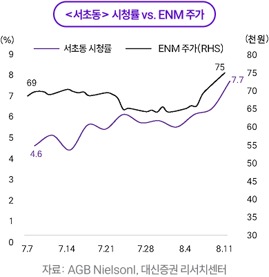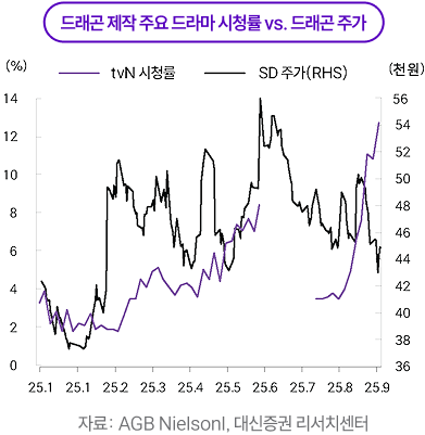 콘텐트리중앙의 주가도 눈여겨볼 만하다. 동사의 주가는 7~8월 -17.4% 하락했는데, 7월에만 하락하고 8월 초에는 반등과 조정을 반복하는 모습을 보였다. 7월 주가 하락은 <굿보이> 종영(7월 20일) 후 후속작 <에스콰이어> 방영(8월 2일)까지 2주간 공백이 원인이었다. 앞서 <굿보이> 효과로 동사의 5~6월 주가는 +25.2% 상승했었다. 후속작 <에스콰이어>는 10회 기준 9.1%의 시청률을 달성하여 동사의 작품 중 올해 최고의 시청률을 기록했다. 동사 주가는 해당 작품 방영 후 +7.5% 상승했다. |