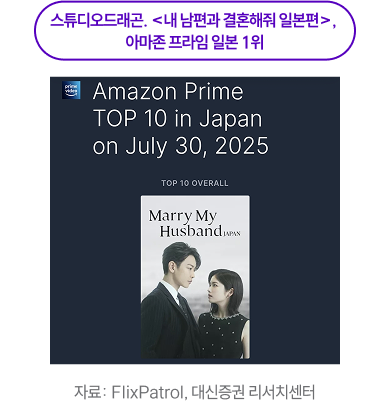 스튜디오드래곤은 14% 하락하며 주가 성과는 좋지 않았지만, 지난 두 달 동안 의미 있는 성과를 거뒀다. 2024년 1월 한국에서 최고 시청률 12%를 기록한 <내 남편과 결혼해줘>의 일본 리메이크판은 6월 27일 일본 아마존 프라임을 통해 공개된 후 1위를 기록했다. 이 소식이 국내에 알려지면서 단기 주가 상승으로 이어진 점이 고무적이다. 7월 1일에는 동사가 일본 현지에서 직접 제작한 <하츠코이 도그즈(첫사랑 dogs)>가 일본 방송사 《TBS》를 통해 방영을 시작했으며, 연내 일본에서 제작하는 작품 한 편이 추가로 공개될 예정이다.