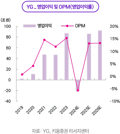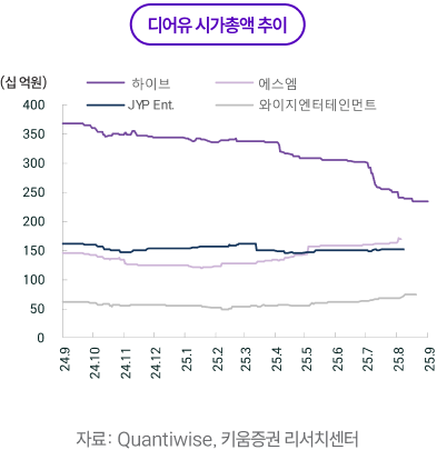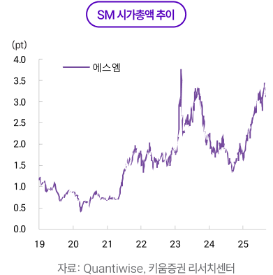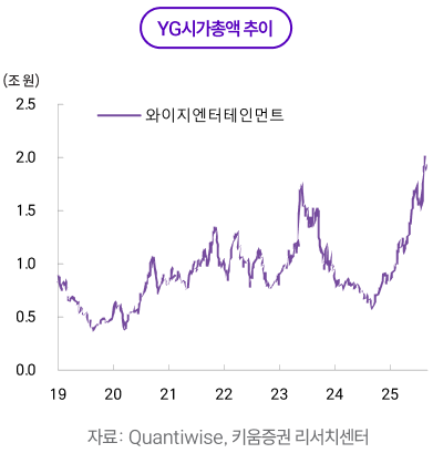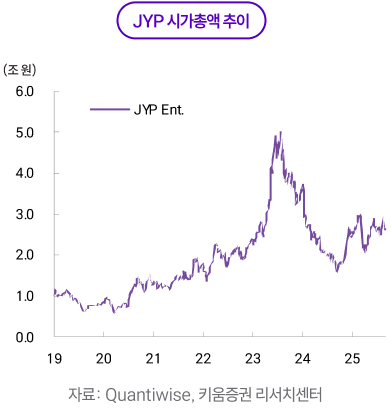 7월~8월 흐름은 7월 조정과 8월 실적 반등으로 정리된다. 7월에는 코스피 +5.7%, 코스닥 +3.0%로 지수는 견조했지만, 엔터주는 하이브 -16%, SM -5.6%, JYP -2.2%, YG -10.6%로 동반 약세를 기록했다. 상반기 누적 강세에 따른 차익실현 움직임이 증가했고, 반도체로 수급이 재집중되면서 성장 업종 전반의 상대 수급이 약화한 영향이 컸다. 3분기는 구조적으로 아티스트 활동 공백이 늘어나는 모멘텀 비수기이기에 수급상으로도 약세를 기록했다. 여기에 2분기 실적을 앞두고 하이브의 주식 보상·신인 투자비 부담, JYP 공연 ‘회당 게런티’ 변수에 따른 실적 변동성 논쟁, SM의 콘텐츠와 공연 준비비 증가에 대한 관측이 겹치며 방어력이 떨어졌다.