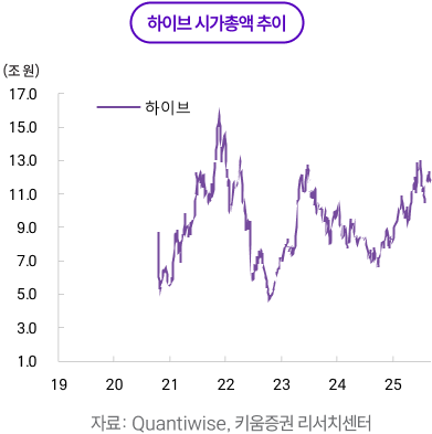 하이브는 -7.1%로 조정됐다. 2분기 콘서트·MD는 양호했으나, 분기 중 계상된 주식 보상 비용과 신인/글로벌 프로젝트 투자비가 일시적으로 마진을 눌렀고, 시장 기대가 컸던 BTS 완전체 컴백 로드맵이 올해 4분기에서 내년 1분기 수준으로 소폭 뒤로 지연될 것이라는 전망이 투자심리에 부담으로 작용했다. 또한 방시혁 의장 관련 이슈가 ‘오너 리스크’로 주목받으며, 외국인·기관 수급이 둔화한 점도 단기 디스카운트를 키운 요인이다. 다만 펀더멘털 측면에서 4분기 세븐틴·엔하이픈·TXT의 본격 활동, 위버스 기반 상시 MD의 SKU 확대 및 중국 팝업의 추가 전개, 해외 현지화 그룹의 트래픽 축적 등은 연말~내년 상반기로 갈수록 이익 추정치 상향 여지를 제공한다. 주가가 평가 가치 하단 근처에서 4분기 라인업 업데이트가 트리거가 될 가능성이 높다.