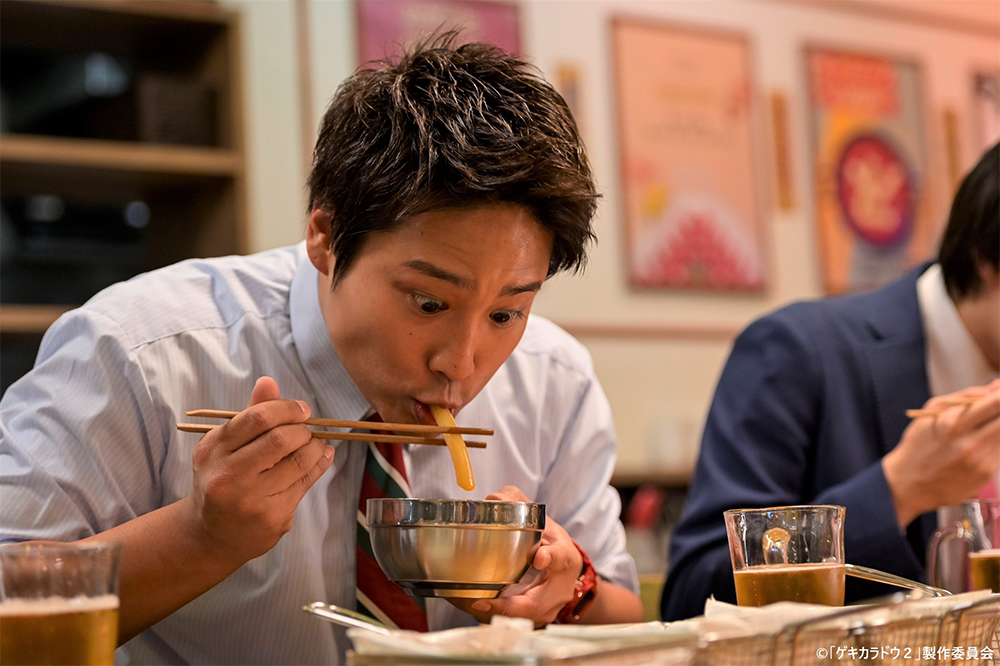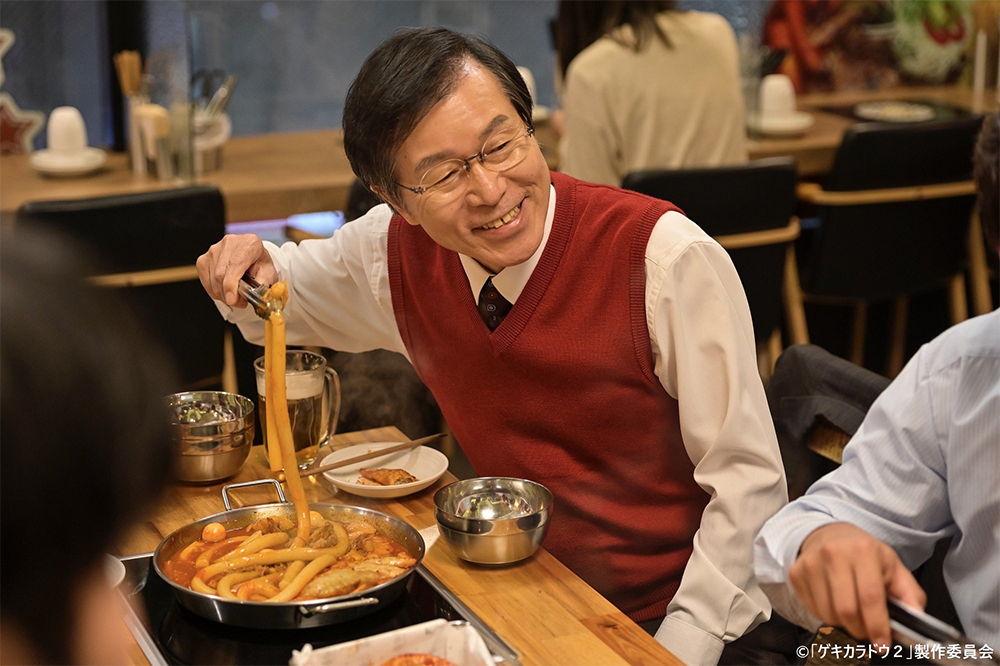 <게키카라도우 시즌2> 2화에 나온 청년다방 '차돌 떡볶이'. 길쭉한 떡을 보고 신기해하는 모습. (출처: 티스토리 블로그(@일사보이)) |
