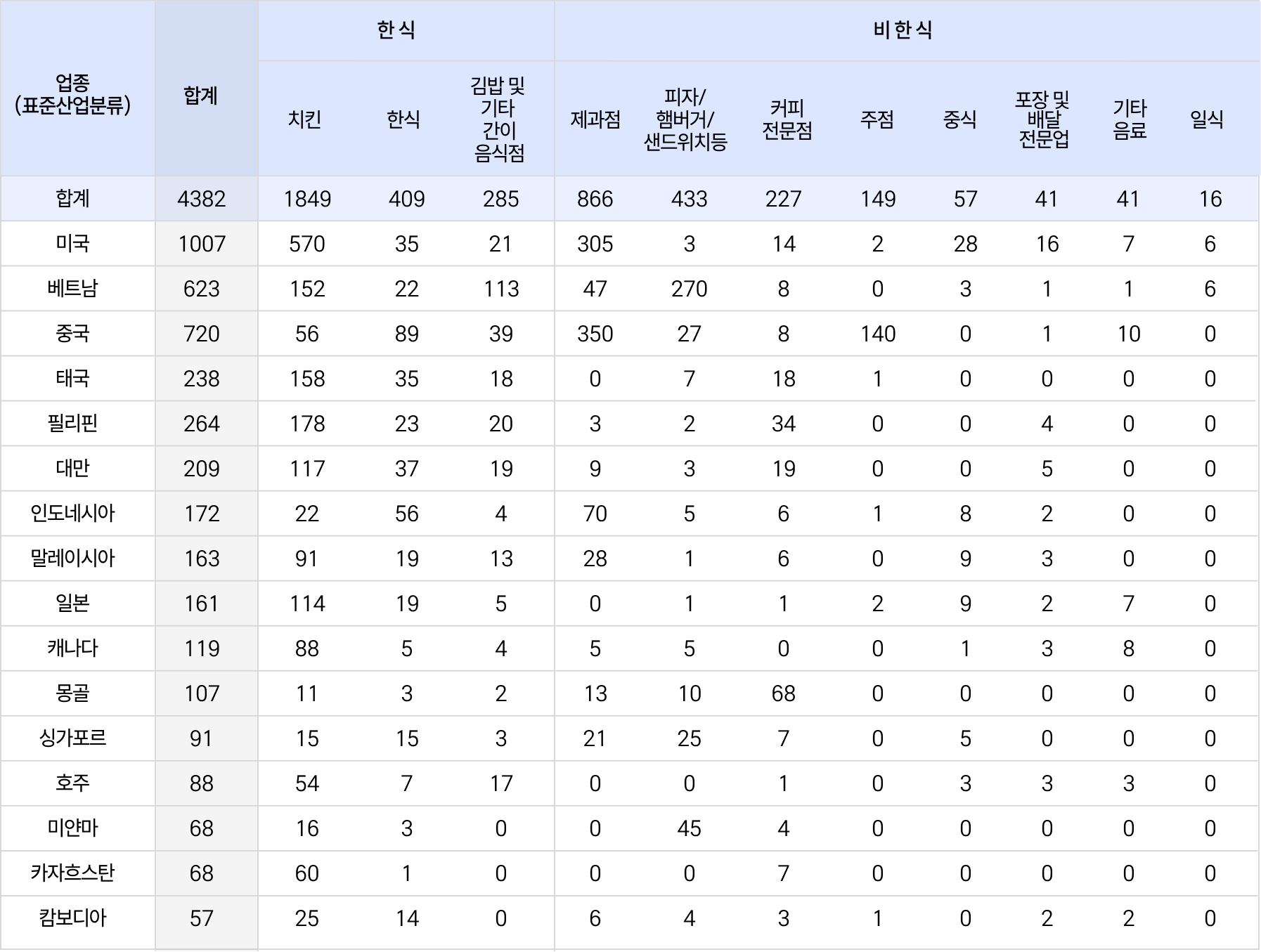 한국외식산업경영연구원의 「2024 외식기업 해외진출 실태조사」를 보면, 일본 내 한국 프랜차이즈는 치킨(114개), 한식(19개), 김밥 및 간이음식점(5개) 순으로 분포한다. 치킨이 압도적인 비중을 차지하고 있다는 것이 특징이다. 이는 한식진흥원의 「2022 해외 한식 소비자 조사」에서 전 세계인의 한식 메뉴 선호도 1위가 한국식 치킨(16.2%)이었던 결과와 일치한다. 일본 소비자들이 기존의 김치, 비빔밥, 불고기보다 치킨에 더 높은 선호를 보인 것은 일본 내 한국 음식 소비가 전통 한식에서 벗어나 더 트렌디한 한식 문화 소비로 옮겨가고 있다는 것을 보여준다.