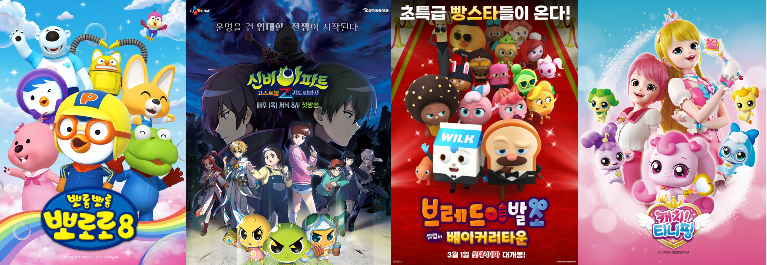 콘텐츠 IP 비즈니스와 함께 성장해 온 한국 애니메이션 (왼쪽부터 <뽀롱뽀롱 뽀로로>, <신비아파트>, <브래드 이발소>, <캐치! 티니핑>) (출처: 《EBS》, CJ 미디어 라이브러리, 몬스터스튜디오, SAMG Entertainment) |