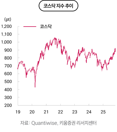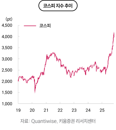 2025년 9~10월, 국내 증시는 금리 인하 기대와 반도체 업황 회복이 맞물리며 강한 상승세를 이어갔다. 동기간 코스피는 +28.9%, 코스닥은 +13.0% 상승하며 전년 대비 뚜렷한 랠리를 기록했다. 특히 외국인 투자자의 순매수가 반도체, 이차전지 대형주로 집중되면서 지수 탄력이 강화됐다. 반면, 엔터테인먼트 업종은 상대적으로 소외된 모습을 보였다.