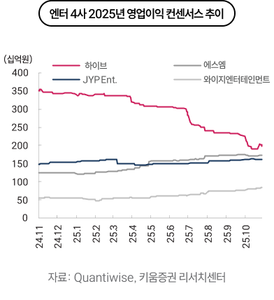 세부적으로 보면, 주요 4사 중 하이브(+20.1%)를 제외한 SM (-13.9%), YG(-9.9%), JYP(+11.3%)는 지수 상승에도 불구하고 부진한 흐름을 보였다. 9월에는 코스피 +7.5%, 코스닥 +5.7% 상승에도 불구하고 하이브 -7.3%, SM -6.3%, YG -3.8%로 동반 약세를 기록했다. 이는 전반적인 수급이 반도체 중심으로 쏠리며 성장주의 상대적 매력도가 저하된 영향이다. 10월 들어 하이브가 +29.6% 급등하며 업종 반등을 주도했으나, SM(-8.1%), YG(-6.3%)는 여전히 조정받았다. 즉, 업종 전체는 보합권에 머물렀지만, 하이브 단독 강세와 나머지 3사 부진이라는 극단적인 차별화가 나타난 시기였다.