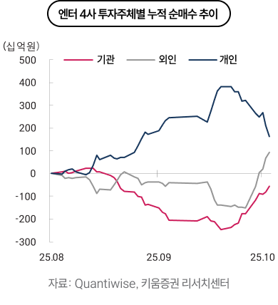 9~10월 엔터 주가는 펀더멘털*보다 매크로** 요인의 영향을 크게 받았다. 금리 인하 기대와 반도체 중심의 자금 쏠림으로 성장 업종 전반의 상대 매력이 약화하며, 엔터 역시 수급상 불리한 위치에 놓였다. 여기에 한중 정상회담을 둘러싼 기대와 실망이 반복되며 단기 변동성이 확대됐다. 하이브는 방탄소년단 완전체 컴백 기대감으로 단독 강세(+20%)를 보였으나, SM과 YG는 각각 미국 사업 성과 부진과 실적 기대치 하회로 조정받았다.
