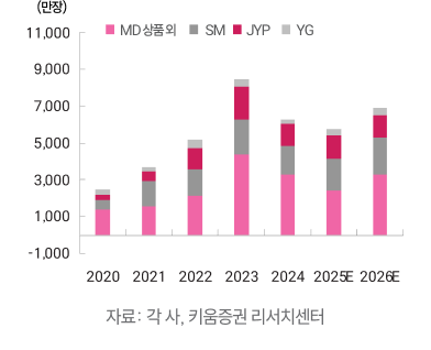 SM이 그 대표적인 예이다. 3분기 MD 매출액은 전 기 대비 감소했지만, 영업이익은 컨센서스*****에 부합했다. 이는 MD 매출 중 로열티형 인식 비중이 높았기 때문으로, 실제 판매량은 예상 수준에 근접했음을 시사한다. 즉, 매출로 인식된 금액이 줄었을 뿐, 실질적인 수익성과 판매 모멘텀은 견조하게 유지된 것이다. 반면 YG는 블랙핑크 MD 매출이 기대치를 하회하며 시장의 실망을 불러왔으나, 이는 구조적인 판매 부진보다는 인식 기준 차이와 일시적 공백기 영향이 컸다. 일부 MD 매출이 로열티 항목으로 분류되면서 총매출액이 감소했고, 이연매출 없이 일시 인식된 점도 매출 변동성을 키웠다.
