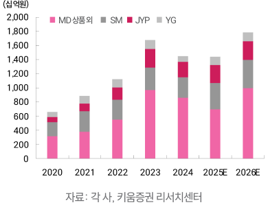 특히 시장은 실적 발표를 앞둔 불확실성과 밸류에이션*** 부담을 동시에 반영하며 방어적 태도를 보였다. 실적을 먼저 발표한 SM과 YG의 3분기 실적은 음반, 공연, MD 모두 전년 대비 두 자릿수 성장세를 지속하며 견조함을 확인시켰다. 다만, MD 일부 매출이 로열티·라이선스 항목으로 인식되며 총매출이 적게 잡힌 점이 시장의 체감 부진으로 이어졌다.
