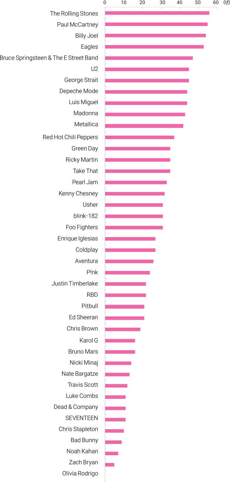 이러한 변화는 아티스트의 활동 수명에도 구조적 변화를 불러왔다. 과거 국내 아이돌은 ‘7년 징크스’라 불리던 계약 만료 주기를 넘기기 어려웠으나, 라이트 팬덤의 확산 이후에는 고연차 IP의 장기 흥행 구조가 정착되고 있다. 2024년 기준 글로벌 상위 40위에 포함되는 투어 아티스트의 70%가 데뷔 20년 차 이상이며, 케이팝 역시 BTS(13년 차), 트와이스(10년 차), 블랙핑크(9년 차), 스트레이키즈(7년 차) 등 고연차 그룹이 여전히 월드 투어를 매진시키고 있다. 음반 중심의 팬덤이 공연·콘텐츠 중심의 구조로 옮겨가면서, 고연차 IP의 브랜드 가치가 누적되고 수익성이 높아지는 ‘선순환 구조’가 형성된 것이다. |