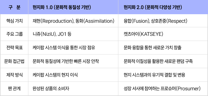 캣츠아이 현상: 한류 패러다임의 전환캣츠아이의 등장은 케이팝 현지화 전략의 근본적인 패러다임 전환을 의미한다. 과거 니쥬(NiziU), JO1 등 아시아권 중심의 현지화 1.0 모델이 케이팝의 성공 공식, 즉 고강도의 트레이닝과 통일성 있는 군무, 정교한 프로듀싱 시스템을 현지에 수출하고 재현(Reproduction)하는 데 중점을 두었다면, 캣츠아이는 ‘문화적 다양성’ 그 자체를 그룹의 정체성이자 창작의 원천으로 삼는 ‘현지화 2.0’ 모델을 제시한다.